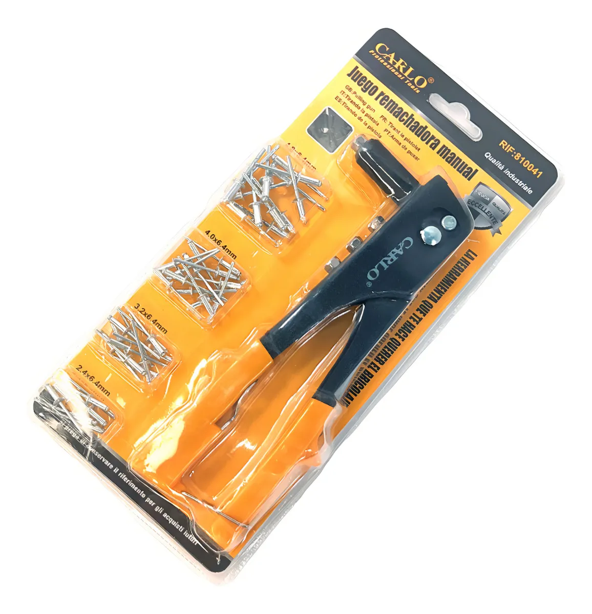 - 4 boquillas cromadas para diferentes tamaños de remache.